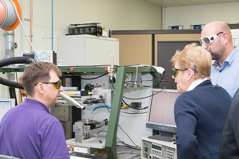 Im Anschluss an die Begrüßung und Firmenvorstellung konnten sich die Teilnehmer bei einem Betriebsrundgang ausgiebig über Produktion und Technik  informieren. So erfuhren sie, dass auf den Laseranlagen der Firma LILA mit gebündelten Lichtstrahlen metallische und keramische Werkstücke geschnitten, geschweißt und gebohrt werden.  Dabei ist LILA Spezialist für die Präzisionsbearbeitung und in der Lage Schnitte und Bohrungen bei Metallen schon ab einer Materialstärke von 0,05 mm vorzunehmen. LILA ist reiner Dienstleister, vertreibt also keine eigenen Produkte, sondert fertigt im Kundenauftrag. Ein bedeutender Branchenschwerpunkt stellt dabei die Medizintechnik dar. So werden Komponenten für Bohrer oder Implantate hergestellt, aber auch filigrane Sägeblätter oder Metallnetze. Weitere Brachen sind die Pharmatechnik und Elektronik, der Maschinenbau und die Automobilzulieferindustrie.